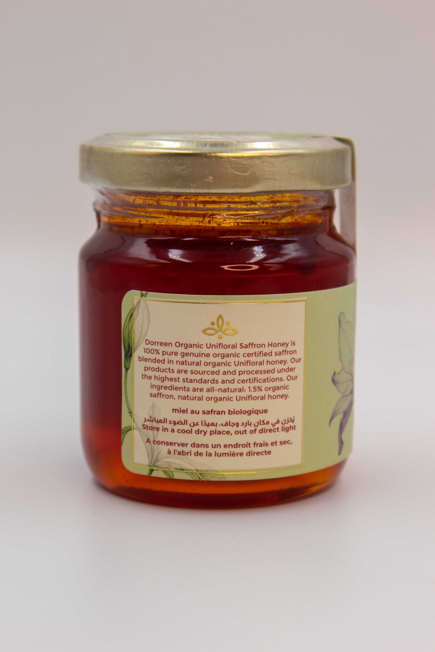 Elevate your wellness rituals with Dorreen's Organic Saffron Honey—a golden fusion of certified organic honey and 1.5% hand-harvested organic saffron powder.